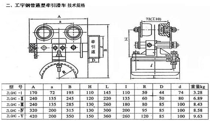 ZLGHC型工字鋼電纜滑車系列分為中載荷型、重載荷型和輕載荷型,因此滑車行走輪為Φ80、Φ63、Φ50的三種。承載能力<50~150kg,每類按托板層數分為單層、雙層、三層,每類中有三種形式。首端為電纜牽引車,終端為固定掛線架,中間為電纜滑車,該系列滑車分Ⅰ、Ⅱ、Ⅲ、Ⅳ、Ⅴ五種型號,如用戶采用12#、14#、16#或更大號數工字鋼,可在訂貨時注明,本公司可成套供貨。
