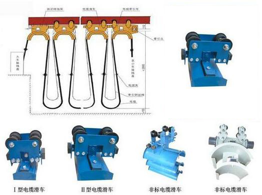 ZLGHC型工字鋼電纜滑車系列為起重機小車供電的一種導電形式。它有走輪、支架、托板組成,將軟電纜固定在托板上,由牽引架與電纜滑車同步,從而實現小車供電的目的。